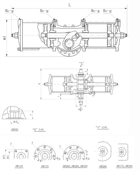 | 基本設(shè)計(jì) | 氣動(dòng)雙氣缸雙活塞拔叉式傳動(dòng) 機(jī)構(gòu); 型號(hào)AWxx=雙作用式; 型號(hào)AWxxS=單作用式(彈簧復(fù)位)。 |