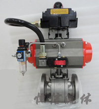 氣動固定球閥有二片式和三片式兩種閥體結構,中法蘭 用螺栓連接,密封采用增強聚四氟乙烯鑲入不銹鋼圈內,鋼圈后部設有彈簧保證閥座緊貼球體,保證密封。上下閥桿均設有PTFE軸 承,減少磨擦,操作省力,小軸底部沒有調整片,保證球與密封圈的接觸位置。采用全通徑的結構使閥門流量孔么與管線內徑一致,以便管線清掃。
